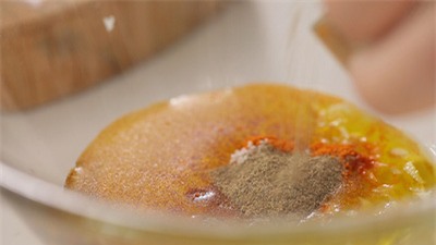 ![]() | ![]() Rau mùi thái rối. Chanh vắt lấy nước cốt. Tỏi bóc vỏ lụa, bằm nhỏ. Chuẩn bị một bát lớn, thêm dầu ô liu, nước cốt chanh, tỏi, ớt bột, muối và hạt tiêu đen vào rồi trộn đều. |
