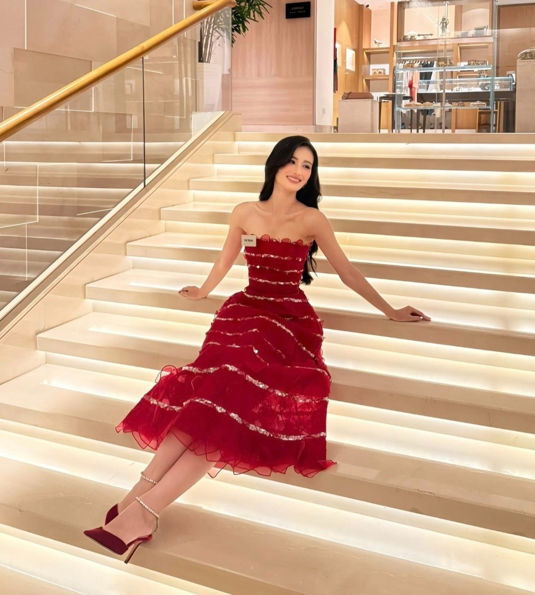 Luôn chỉn chu trong diện mạo, Ý Nhi ghi điểm với phong cách thời trang đa dạng từ váy dạ hội thướt tha đến trang phục nhẹ nhàng, tinh tế. Cô khéo léo kết hợp kiểu tóc xoăn nhẹ, búi cao thanh tú, tôn lên vẻ đẹp hiện đại, gần gũi.