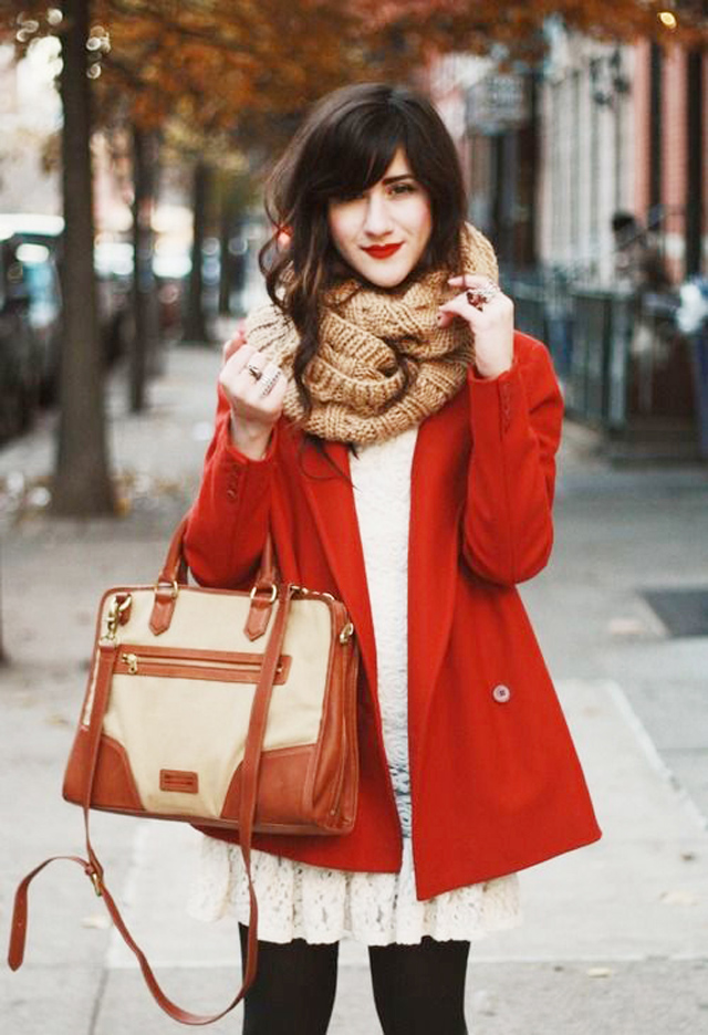 Áo khoác đỏ kết hợp cùng váy ren trắng tinh khôi và quần skinny là chị em đã có ngay cây đồ xuống phố đêm Giáng sinh thật quyến rũ.