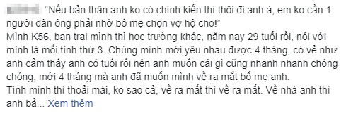 Theo lời kể của chủ top, mới yêu nhau 4 tháng bạn trai đã muốn dẫn cô về ra mắt bố mẹ, tuy thấy hơi vội vã nhưng vốn tính thoải mái nên cô cũng không từ chối. Tưởng mọi sự nhanh chóng là do người yêu lớn tuổi nhưng sự thật còn oái oăm hơn nhiều, khiến cô gái bức xúc.