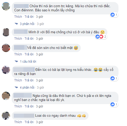 "Thôi bạn ơi mặc kệ bà chị dâu xấu bụng ấy, kiểu người đó thì có gì họ cũng nói được, nếu chửa trước thì lại bảo mình chơi bời đến mức có thai cho xem"; "Chưa cưới về đã biết không tôn trọng thì sau này cũng chẳng cần quan tâm chị dâu chồng làm gì, tránh ra cho đỡ phiền là được"; "Sống với bố mẹ chồng cả chồng chứ có cần chị dâu quái đâu, bỏ ngoài tai hết đi em ơi"...