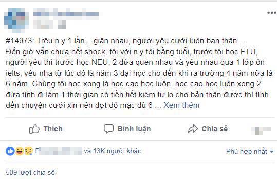 Ngay thời điểm đó chàng trai chỉ nghĩ nói đùa cho vui và người yêu cũng khẳng định sẽ chờ đợi. Đột nhiên, một thời gian ngắn sau cô nàng nói lời chia tay. Sau 2 tuần chiến tranh lạnh, cô nàng cho hay mình đã yêu người khác. Sau khi tìm hiểu, chàng trai vô cùng bất ngờ khi anh chàng đó không phải ai khác chính là cậu bạn thân. “Tháng 6 vừa qua họ đã làm đám cưới. Thực sự đến giờ tâm lý đã ổn định hơn nên tôi mới dám tâm sự, có phải tôi đã đùa ngu quá đúng không? Vì câu nói của tôi mà chỉ 4 tháng sau người yêu cũ đã lấy luôn bạn thân. Chuyện đó ai ngờ...”, chàng trai viết.