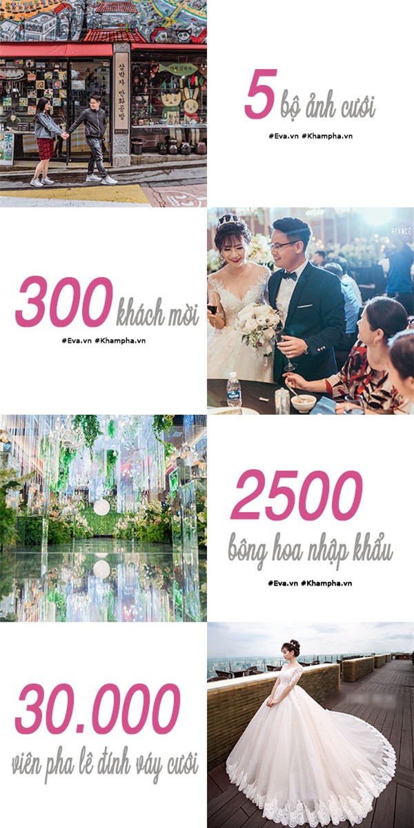 Chú rể còn yêu cầu trang trí toàn bộ tiệc cưới bằng 45.000 viên pha lê cùng 2.500 bông hoa tươi nhập khẩu theo tone màu hồng pastel, trắng, xanh để cùng tone màu với váy cưới của cô dâu.