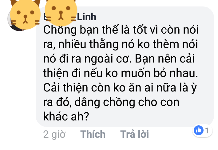 Nhiều bà vợ đồng loạt lên tiếng, chị chủ TOP nên lấy làm vui mừng vì chồng đã thẳng thắn nói ra, còn hơn chán nản vợ rồi âm thầm đi "tìm nguồn" bên ngoài. Tài khoản B.M.L chia sẻ: "Chồng bạn thế là tốt vì còn nói ra, nhiều thằng nó không thèm nói nó đi ra ngoài cơ. Bạn nên cải thiện đi nếu không muốn bỏ nhau. Cải thiện còn không ăn ai nữa là ỳ ra đó, dâng chồng cho cô khác à?".