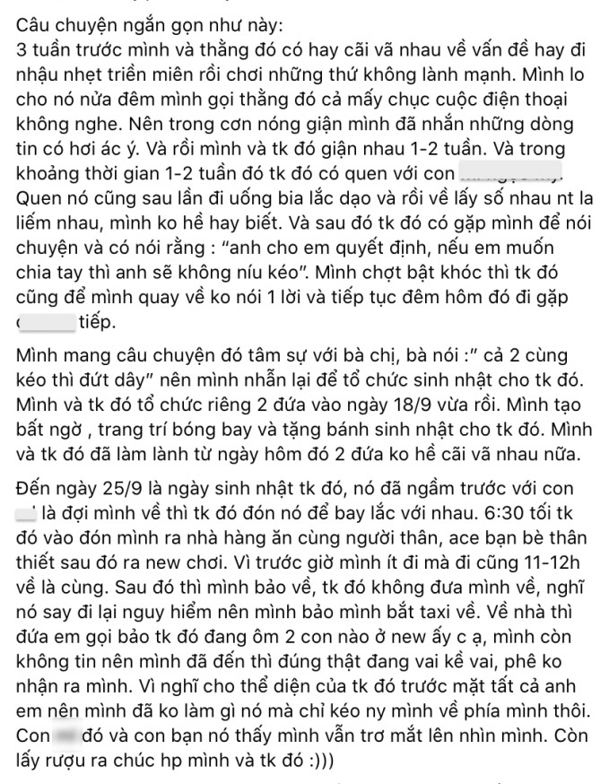 Theo như cô gái tên M. chia sẻ, hai người quen nhau từ 9 năm trước, trải qua mọi thăng trầm, yêu xa 4 năm đại học, cùng nhau trưởng thành cùng nhau lớn lên, có thể nói anh là người bạn tri kỷ và cũng là người mà cô thương nhất. Nhưng cuối cùng thứ tình cảm thanh xuân đó lại bị anh chàng dẫm đạp lên một cách đớn đau.