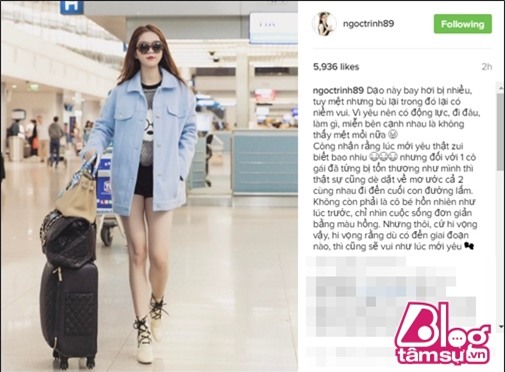 Cô viết: “Dạo này bay hơi bị nhiều, tuy mệt nhưng bù lại trong đó lại có niềm vui. Vì yêu nên có động lực, đi đâu, làm gì, miễn bên cạnh nhau là không thấy mệt mỏi nữa.