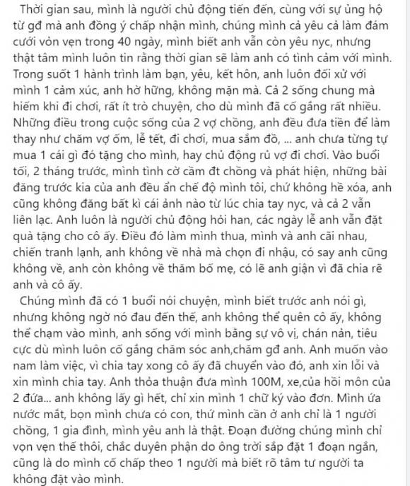 Chúng mình đã có 1 buổi nói chuyện, mình biết trước anh nói gì, nhưng không ngờ nó đau đến thế. Anh không thể quên cô ấy, không thể chạm vào mình, anh sống với mình bằng sự vô vị, chán nản, tiêu cực dù mình luôn cố gắng chăm sóc anh, chăm gia đình anh. Anh muốn vào Nam làm việc, vì chia tay xong cô ấy đã chuyển vào đó. Anh xin lỗi và xin mình chia tay. Anh thỏa thuận đưa mình 100 triệu, xe, của hồi môn của 2 đứa... Anh không lấy gì hết, chỉ xin mình 1 chữ ký vào đơn. Mình ứa nước mắt, bọn mình chưa có con, thứ mình cần ở anh chỉ là 1 người chồng, 1 gia đình, mình yêu anh là thật. Đoạn đường chúng mình chỉ vọn vẹn thế thôi, chắc duyên phận do ông trời sắp đặt 1 đoạn ngắn, cũng là do mình cố chấp theo 1 người mà biết rõ tâm tư người ta không đặt vào mình. Mình đã thua rồi!".