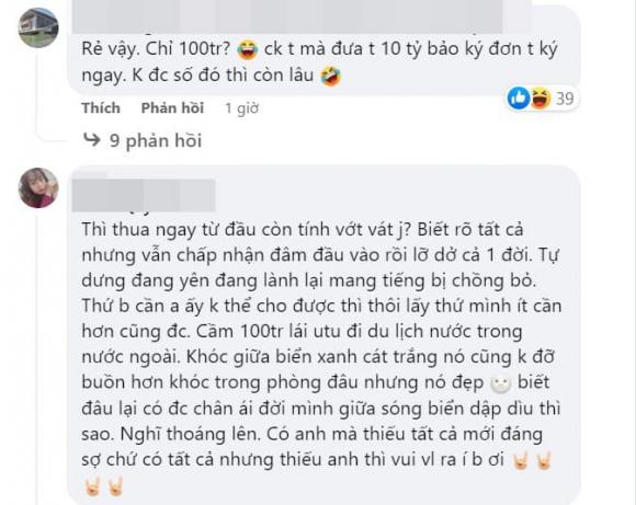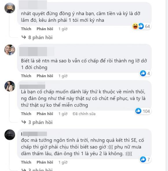 Dưới bình luận, nhiều người cho rằng cô gái này ngay từ đầu không nên cố chấp kết hôn với người chồng không quên được tình cũ: "Ngay từ đầu đã rõ kết quả, sao vẫn cố chọn cầm mũi dao", "Nói thật tình cảm con người mà trả bằng tiền à! Nếu là mình 100 hay 1000 tỷ mình cũng không cầm và sẵn sàng ký! Vì tình cảm của người con gái không mua được bằng tiền! Thương cho chị biết khổ nhưng vẫn lau vào vì yêu! Thôi coi như đó là do chị nợ anh ấy ở kiếp trước, ký vào coi như trả xong nợ chị ạ!", "Biết thứ không phải của mình nhưng vẫn cố chấp đâm đầu vào thì chịu rồi"...