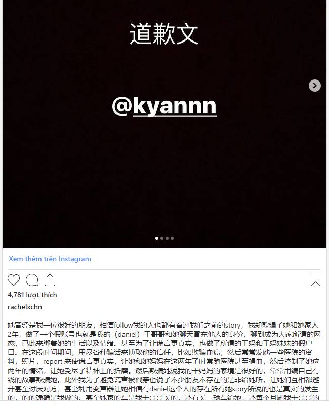 "Hôm nay, tôi không thể tha thứ được cho bản thân mình vì đã gây ra quá nhiều tổn hại cho cô ấy, khi cô ấy từng tin tưởng và đối xử chân thành với tôi đến thế. Một lần nữa, tôi muốn nói lời xin lỗi Ky và gia đình cô ấy. Xin lỗi vì những tổn hại mà tớ đã gây ra cho cậu", trích lời xin lỗi của Rachel trong bài đăng.