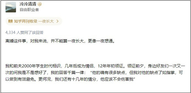 Một người phụ nữ đã chia sẻ câu chuyện hôn nhân của cô trên diễn đàn Zhihu. Hai người gặp nhau khi còn là sinh viên, vài năm sau thì trở thành một cặp. Trải qua 12 năm từ lúc quen biết tới yêu đương, họ chính thức trở thành vợ chồng.