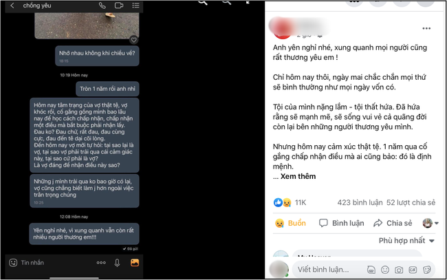 "Tròn 1 năm rồi anh nhỉ, hôm nay tâm trạng của vợ thật tệ. Vợ khóc rồi, cố gắng gồng mình bao lâu nay để học cách chấp nhận, chấp nhận một điều bắt buộc phải nhận lấy.