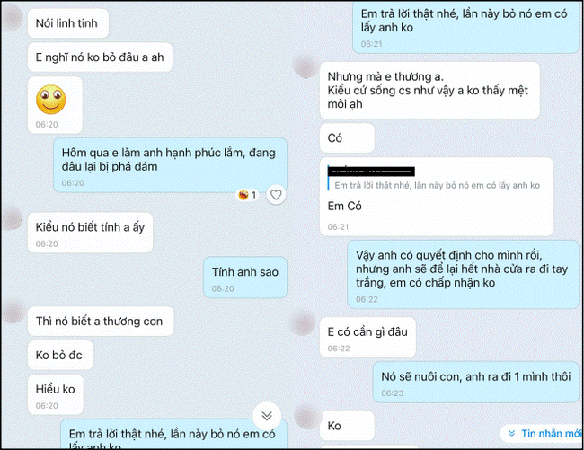 - Vậy anh quyết định cho mình rồi, anh sẽ để lại hết nhà cửa, ra đi tay trắng, em có chấp nhận không? Nó sẽ nuôi con, anh ra đi một mình thôi”.