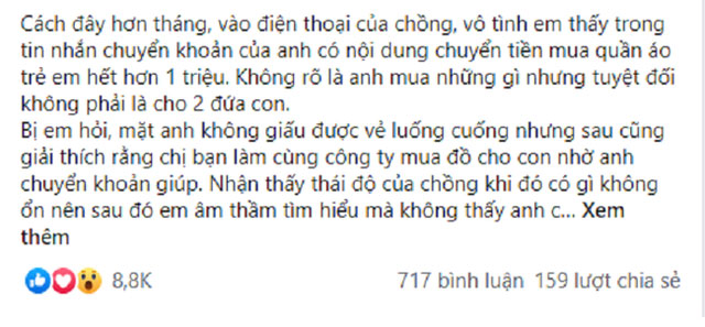 "Cách đây hơn tháng, vào điện thoại của chồng, vô tình em thấy trong tin nhắn chuyển khoản của anh có nội dung chuyển tiền mua quần áo trẻ em hết hơn 1 triệu. Không rõ là anh mua những gì nhưng tuyệt đối không phải là cho 2 đứa con.
