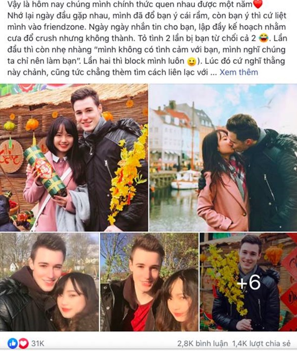 Cô bạn Tăng Cát Lâm đã kể về câu chuyện "cưa đổ trai Tây" của mình. Sau khi đăng lên mạng, chuyện tình yêu ấy đã nhận về được hơn 31 nghìn lượt yêu thích của cộng đồng mạng.
