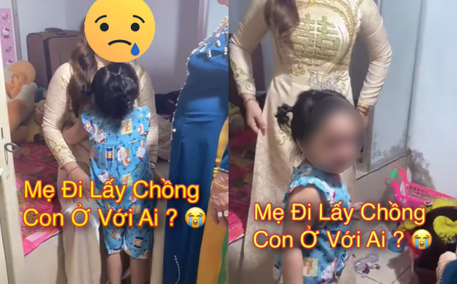 Đính kèm chính là đoạn clip ngắn. Bé con mặc bộ đồ ở nhà, ôm chặt lấy mẹ mình - người diện áo dài cô dâu. Bé liên tục khóc, không muốn mẹ đi, mặc kệ cho bà ngoại và những người xung quanh khuyên nhủ.
