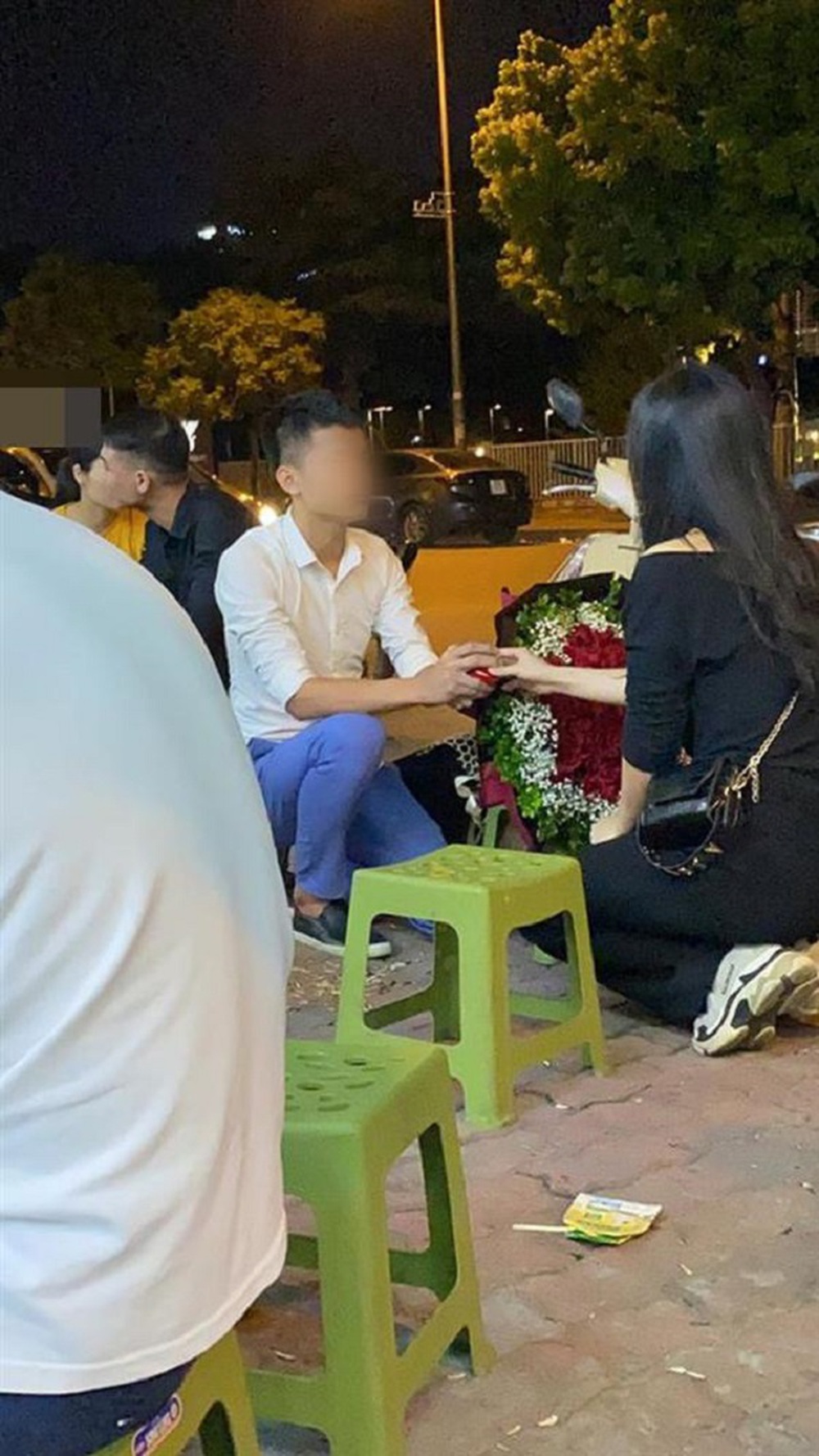 Không bỏ cuộc, anh chàng vẫn tiếp tục muốn trao nhẫn cho cô. Quá bất ngờ, cô gái lập tức ngồi xuống nói chuyện với anh bằng thái độ căng thẳng. Cô gái từ chối nhưng chàng trai vẫn tiếp tục quỳ gối như thế, cô miễn cưỡng nhận hoa nhưng từ chối chiếc nhẫn. Sau đó, nam thanh niên mất bình tĩnh, vứt nhẫn xuống vỉa hè không hề thương tiếc rồi bỏ đi.