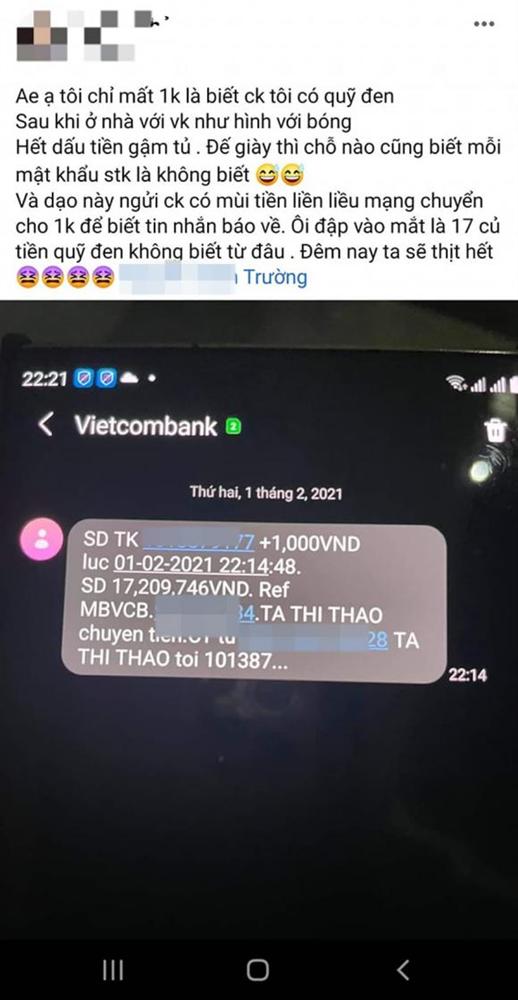 Cụ thể người vợ chia sẻ: "Anh em ạ, tôi chỉ mất 1 nghìn đồng để biết chồng tôi có quỹ đen. Sau khi ở nhà với vợ như hình với bóng. Hết giấu tiền gậm tủ, để giày chỗ nào cũng biết mỗi số tài khoản là không biết.