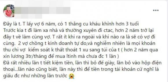 "Đây là tôi. Tôi lấy vợ 6 năm, có 1 thằng cu kháu khỉnh hơn 3 tuổi. Trước kia tôi đi làm xa nhà và thường xuyên đi công tác, hơn 2 năm trở lại đây tôi về làm cùng vợ. Tôi rất ít khi ra ngoài và khi nào ra là sẽ có vợ đi cùng. 2 vợ chồng tôi kinh doanh tự do, và nghiễm nhiên là mọi khoản thu chi vợ kiểm soát không thất thoát 1 xu sang túi của tôi (hơn 2 năm qua xin lương 3 triệu /tháng để mua linh tinh mà chưa được 1 lần).