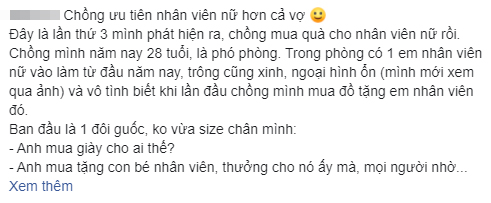 Theo đó, chồng chủ top là phó phòng nhưng rất chăm mua quà thưởng cho nhân viên làm tốt trong khi vợ cần gì thì luôn là điệp khúc “em tự đi mà mua” hay “anh không có thời gian”…