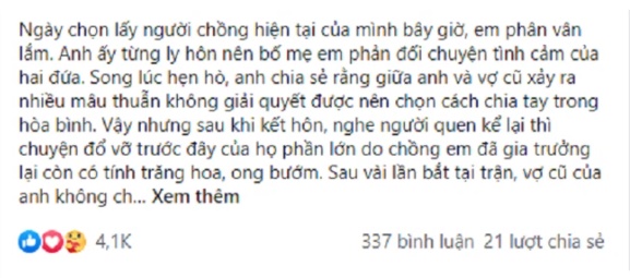 Câu chuyện của cô như sau: "Ngày chọn lấy người chồng hiện tại của mình bây giờ, em phân vân lắm. Anh ấy từng ly hôn nên bố mẹ em phản đối chuyện tình cảm của hai đứa. Song lúc hẹn hò, anh chia sẻ rằng giữa anh và vợ cũ xảy ra nhiều mâu thuẫn không giải quyết được nên chọn cách chia tay trong hòa bình. Vậy nhưng sau khi kết hôn, nghe người quen kể lại thì chuyện đổ vỡ trước đây của họ phần lớn do chồng em đã gia trưởng lại còn có tính trăng hoa, ong bướm. Sau vài lần bắt tại trận, vợ cũ của anh không chấp nhận được mới đệ đơn ra tòa chứ không phải do bất đồng quan điểm sống, cũng không phải do anh chủ động ly hôn như những gì anh kể.
