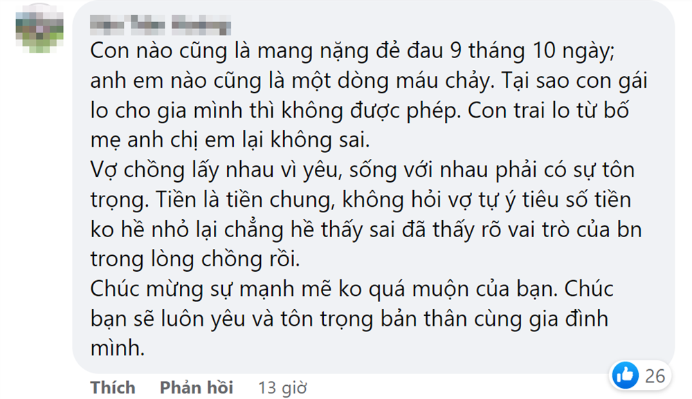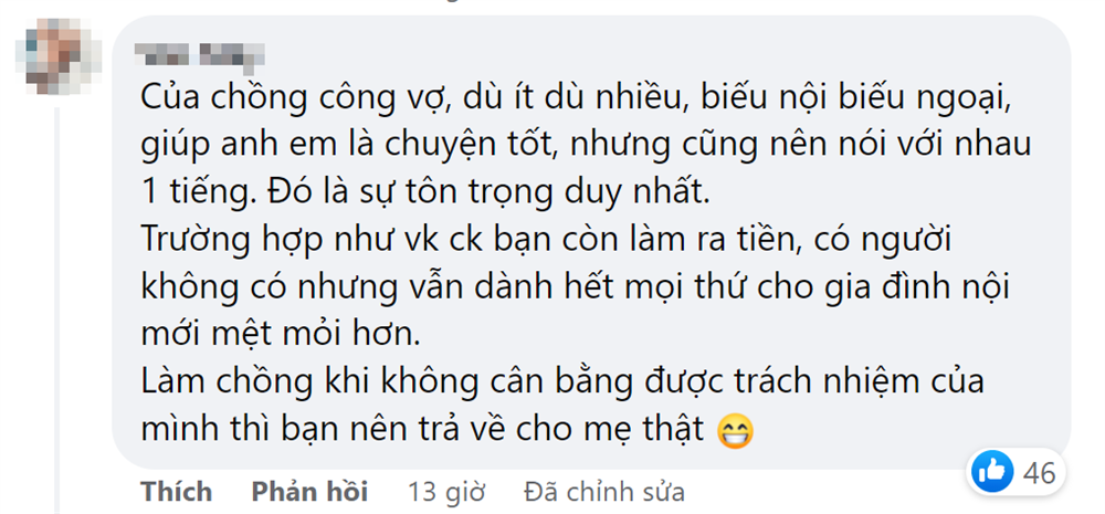 Gần đây mình phát hiện ra khoản tiền vợ chồng tích cóp bị bốc hơi mất một nửa. Hỏi ra thì mới biết anh cho em gái 300 triệu để chạy biên chế vào bệnh viện tỉnh, cưới em trai út anh mừng cưới 5 chỉ vàng, anh cho bố mẹ hơn 2 tỷ để xây nhà báo hiếu công dưỡng dục sinh thành. Anh nói: "Số tiền đó anh sẽ cố gắng để hoàn vào tài khoản sớm nhất cho em ,nhưng lại bị em phát hiện mất rồi. Anh xin lỗi vì đã không nói gì với em". Đến nước này thì mình thực sự không thể kìm nén được nữa. Bao nhiêu uất ức, tủi thân cứ thế tuôn trào.