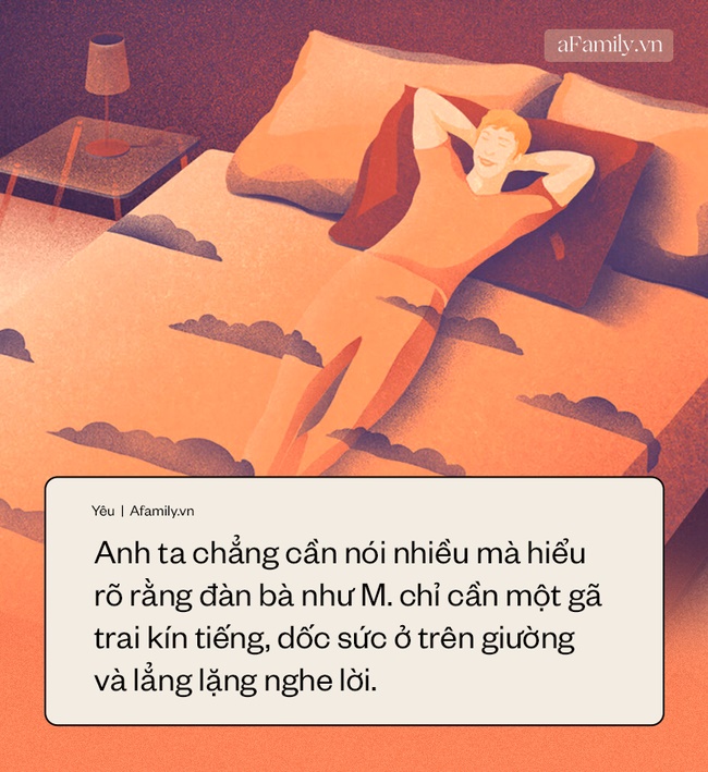 Tuy vậy, chồng M. rất kém chuyện giường chiếu. Với một người phụ nữ bước vào độ tuổi hồi xuân, lúc nào cũng hừng hực như M. thì ngủ cạnh ông chồng vừa béo, vừa lùn, vừa xấu lại 'bất lực' thực sự quá mức thiệt thòi.