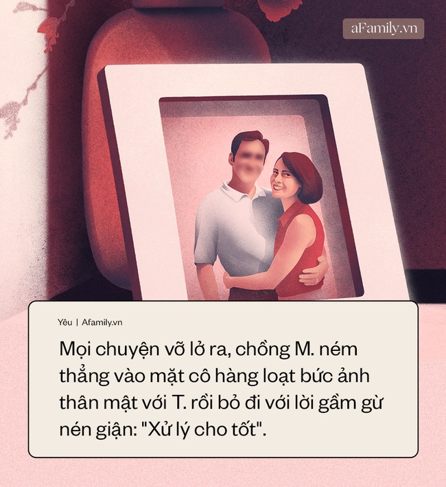 Thế nhưng một ngày chồng M. biết chuyện. Chẳng hiểu nghi ngờ vợ thế nào mà chồng cô quyết định thuê thám tử tư điều tra vợ. Mọi chuyện vỡ lở ra, chồng M. ném thẳng vào mặt cô hàng loạt bức ảnh thân mật với T. rồi bỏ đi với lời gầm gừ nén giận: "Xử lý cho tốt".