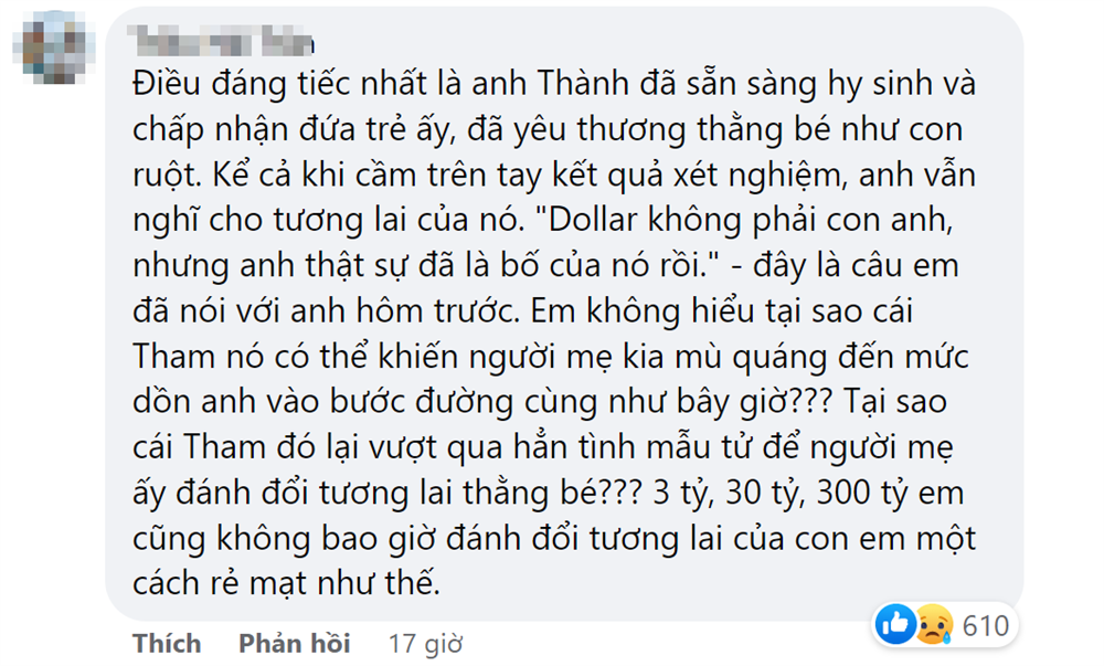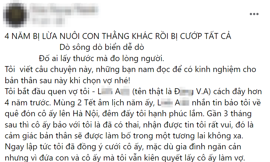 “Khi ra toà, tôi đồng ý không tranh chấp tài sản, mọi thứ cho cô ấy hết để nuôi con. Nhưng đâu có dừng ở đó, cô ấy vẫn tiếp tục bêu rếu tôi trên mạng xã hội đến mức bạn bè tôi nhắn tin hỏi tôi tình hình gia đình sao lại căng đến mức ý. Thế rồi khi mọi người nghe tôi nói có khuyên tôi nên đi xét nghiệm ADN đứa con… tôi đã đi kiểm tra và phát hiện ra đấy không phải con trai tôi, 4 năm qua tôi đã nuôi con người khác! Đến lúc này tôi mới hiểu rằng cô ấy đã lừa dối tôi ngay từ đầu để tìm cha cho đứa bé và tìm người nuôi dưỡng 2 mẹ con khi chưa có đủ điều kiện để tự sống một mình. Đến giờ, khi đã có số tiền gần 4 tỷ để sinh sống, cô ấy đã âm mưu tìm mọi cách để chiếm đoạt tài sản cho riêng mình. Thử hỏi tôi là kẻ đáng thương hay đáng trách?