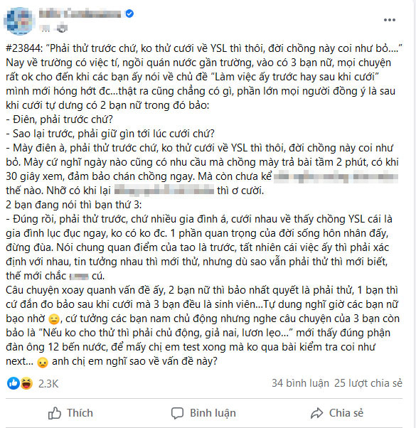 Theo lẽ thông thường thì người con gái nên giữ gìn cho tới lúc cưới và đây cũng là ý kiến của một bạn nữ trong nhóm. Vậy nhưng 2 bạn còn lại thì ra sức phản đối quan điểm bị cho là cổ hủ này, bởi vì “không thử cưới về yếu sinh lý thì thôi, đời chồng này coi như bỏ”, “nhiều gia đình cưới nhau về thấy chồng yếu sinh lý cái là gia đình lục đục ngay”…