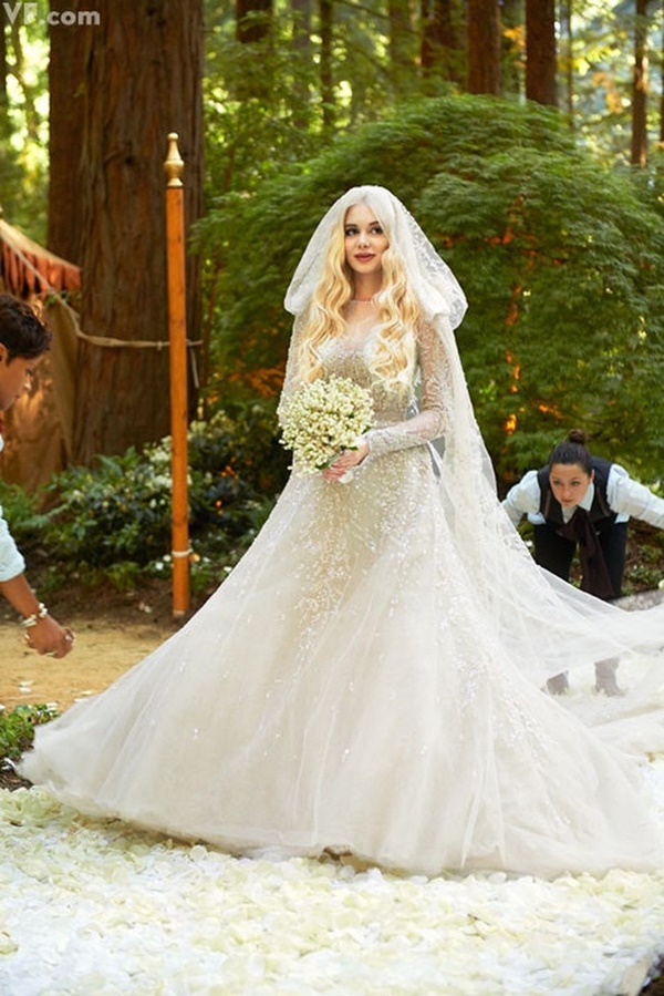 Cô dâu đã lựa chọn thương hiệu siêu sang Elie Saab để làm váy cưới cho mình. Đây là váy cô dâu được kết từ hàng trăm viên pha lê và ren rất cầu kỳ.