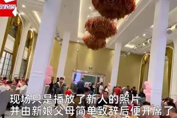 Trong đám cưới vào giữa tháng 4 ở tỉnh Hà Nam, Trung Quốc, bố mẹ cô dâu đã có bài phát biểu dài 20 giây trước những vị khách ngồi trong phòng tiệc lớn. Tuy nhiên nhân vật chính thì không có mặt. Mọi người chỉ được nhìn thấy cô dâu chú rể qua ảnh cưới được chiếu trên màn hình lớn phía trên sân khấu.