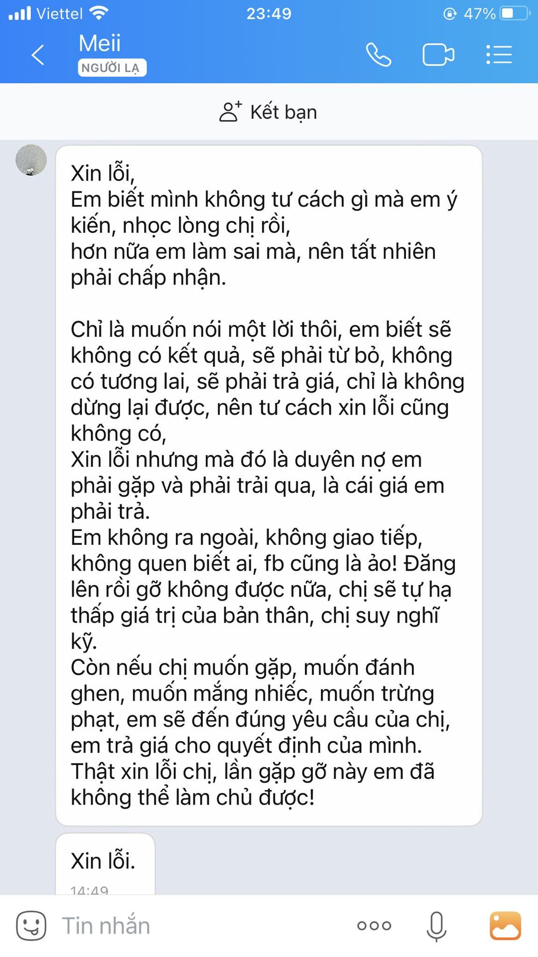 Mở đầu tin nhắn, cô nàng tiểu tam tự nhận mình sai nhưng sau đó lại cố ngụy biện cho hành động phá hoại hạnh phúc gia đình người khác bằng một loạt lý do đáng thương của bản thân như: “không ra ngoài”, “không giao tiếp”; sống ảo… Cô này còn cố ý tâng giá trị của người vợ, tự hạ thấp bản thân, nói sẽ sẵn sàng trả giá vì việc làm sai trái của mình. Ấy thế nhưng cuối cùng vẫn là “em không dừng lại được”, em không làm chủ được bản thân… như thế dù biết mình sai, dù biết mình có lỗi với chính thất nhưng vẫn sẽ không từ bỏ chuyện dây dưa với chồng người khác. Chốt lại, dù có văn vẻ và tỏ ra học thức thế nào thì đây vẫn là giọng văn cùn của những cô nàng tiểu tam không biết hối cải, không biết quay đầu để đi con đường đúng.