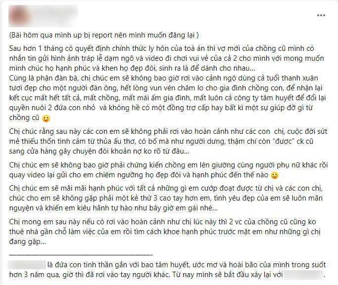 Chị mong em sau này nếu có rơi vào hoàn cảnh như chị lúc này thì 2 vợ chồng của chồng cũ cũng không thuê nhà gần chỗ làm việc của em rồi tìm cách khoe hạnh phúc trước mặt em như những gì chị đang gặp…".