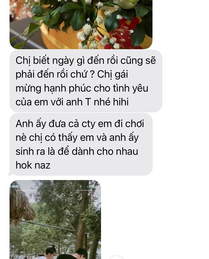 Đính kèm bài đăng là 1 loạt đoạn chat với nội dung khá nực cười từ vợ mới của chồng cũ. Cô này thường xuyên khiêu khích T.L với những câu như: "Anh ấy đưa cả công ty em đi chơi nè chị có thấy em và anh ấy sinh ta là để dành cho nhau không?", "Để tôi phát cho chị ít tiền lẻ mừng tuổi năm mới nhé chị gái", "Chuẩn bị dọn đồ cút khỏi công ty nên ghen ăn tức ở à?"…