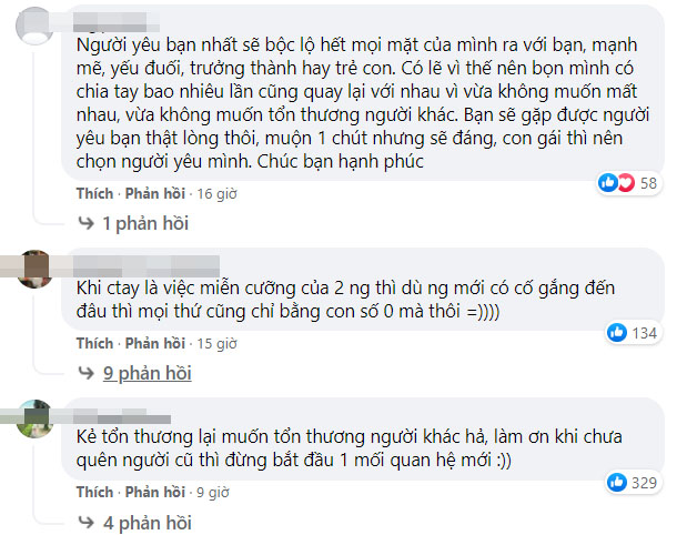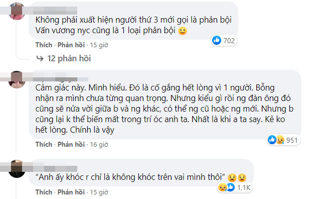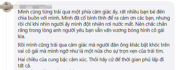 Theo dõi câu chuyện, rồi ý nghĩ “Anh ấy khóc rồi, chỉ là không khóc trên vai mình mà thôi” của chủ top, mà ai nấy đều cảm thấy xót xa, thương cảm. Nhiều người đã bày tỏ sự chia sẻ sâu sắc với cô gái trẻ, bởi họ thấu hiểu cảm giác hụt hẫng và đau đớn của cô khi chứng kiến người mình yêu lúc yếu đuối mệt mỏi nhất lại tìm đến người cũ chứ không phải là mình. Đó chẳng khác nào là một sự phản bội!