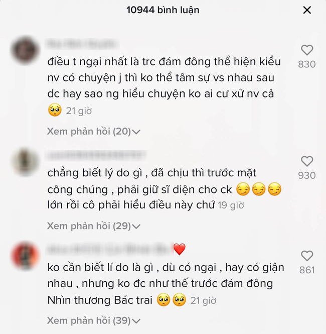 Dù thế, đoạn clip này sau khi được chia sẻ lên mạng xã hội đã vấp phải nhiều ý kiến trái chiều. Không ít dân mạng đã buông lời chê trách bác gái không ngớt: 'Có ai thấy bác trai tội nghiệp như tôi không? Ở chỗ đông người dù có chuyện gì bác gái cũng không nên làm vậy, có chuyện gì thì vợ chồng đóng cửa bảo nhau sau', 'Giận dỗi sao thì giận dỗi nhưng trước đám đông làm thế người ta đánh giá', 'Bác trai tuy cười nhưng trong lòng chắc rất buồn', 'Chẳng biết lý do là gì, đã chịu thì trước mặt công chúng phải giữ thể diện cho chồng. Lớn rồi cô phải hiểu điều này chứ'...