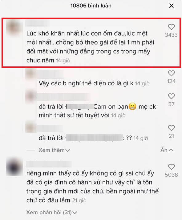 Ở một bình luận khác, nàng dâu cũng cho biết mẹ chồng mình đã rất vất vả nuôi chồng mình khôn lớn, vì bố chồng đã bỏ đi theo người khác: 'Lúc khó khăn nhất, lúc con ốm đau, lúc mệt mỏi nhất, chồng bỏ đi theo gái, để lại một mình phải đối mặt với những đắng cay trong cuộc sống mấy chục năm'.