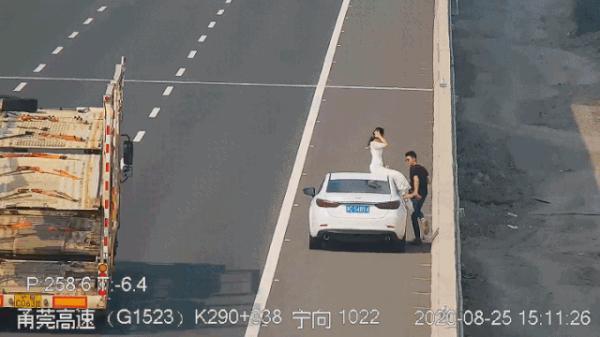 Ngày 25/8, gần lối ra sân bay trên đường cao tốc địa phận Ninh Ba - Đông Quan (Trung Quốc), một cặp đôi, trong đó cô gái mặc áo cưới, đứng chênh vênh trên chiếc ô tô màu trắng đỗ trên làn đường dừng khẩn cấp mà không có bất kỳ biện pháp an toàn nào.