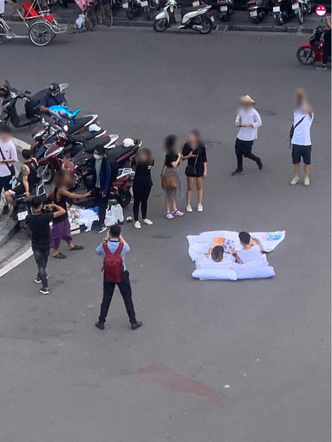 Từ bài đăng của một dân mạng trên group nổi tiếng, hậu trường bộ ảnh cưới được thực hiện bởi một nhiếp ảnh gia nổi tiếng trở thành tâm điểm chú ý của mọi người. Theo tài khoản facebook trên thì những hình anh "chướng mắt" được ghi lại trên phố đi bộ Hồ Gươm trong giờ tan tầm. Cặp đôi trong ảnh được cho là mang chăn gối ra trải giữa đường là để quay hoặc chụp bộ ảnh cưới lãng mạn. Nhưng, chỉ chưa đầy 10 phút sau, công an khu v5ực xuất hiện và... "đưa cặp đôi lên phường uống nước chè".