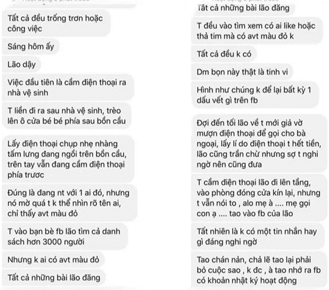 "Đúng là nhắn tin cho ai đó nhưng mờ quá không nhìn rõ tên ai, chỉ thấy avatar màu đỏ. Tao vào bạn bè facebook lão tìm cả danh sách hơn 3000 người, không ai có avatar màu đỏ", vợ tiếp tục kể.