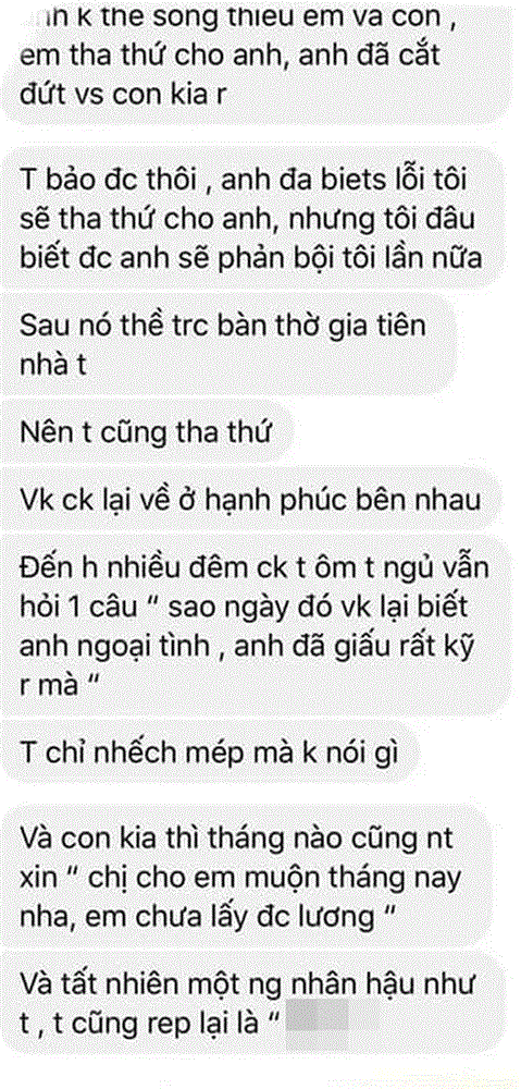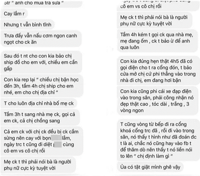 "Nghe thấy to tiếng mẹ chồng và em chồng với chị chồng từ trên tầng chạy xuống. Tao bảo mày cứ vào nhà đi, nó xanh mặt cũng vào nhà. Tao gọi cả mẹ chồng, chị chồng và em chồng ra giới thiệu: 'Thưa mẹ, đây chính là em T. người yêu hiện tại của chồng con".