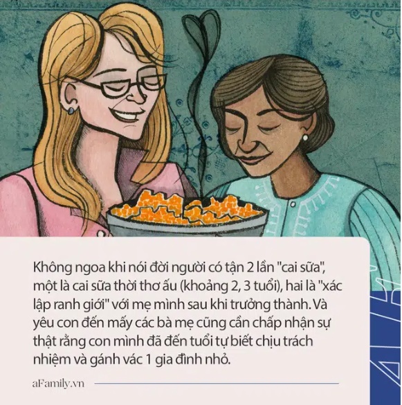 Không ngoa khi nói đời người có tận 2 lần "cai sữa", một là cai sữa thời thơ ấu (khoảng 2, 3 tuổi), hai là "xác lập ranh giới" với mẹ mình sau khi trưởng thành. Đôi khi khoảng cách tạo ra điều tốt đẹp. Và yêu con đến mấy các bà mẹ cũng cần chấp nhận sự thật rằng con mình đã lớn, đã đến tuổi tự biết chịu trách nhiệm và gánh vác 1 gia đình nhỏ.