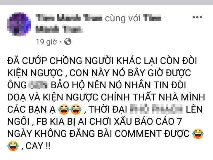 Ngỡ tưởng sự việc đã lắng xuống thì người cháu quen biết của chị vợ lại lên tiếng đầy bức xúc: "Đã cướp chồng người khác còn đòi kiện ngược". Anh chàng cho hay, sau khi "đòi công bằng" cho cô mình thì facebook anh bị kẻ xấu report 7 ngày không đăng bài được.