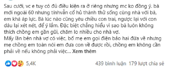 Cũng bởi quá ngột ngạt với cảnh làm dâu của mình, mới đây một nàng dâu trẻ đã lên mạng xã hội chia sẻ câu chuyện gia đình mình. Chuyện cô kể như sau: "Sau cưới, vợ chồng em tuy có đủ điều kiện ra ở riêng nhưng mẹ chồng không đồng ý. Mẹ chồng em mới ngoài 60 nhưng tính bà vẫn cổ hủ thành thử sống cùng nhà với bà, em khá áp lực. Bà lúc nào cũng yêu chiều con trai, ngược lại với con dâu lại xét nét, để ý lắm. Đặc biệt chẳng hiểu vì sao bà luôn không thích chồng em gần gũi, chăm lo nhiều cho nhà vợ.