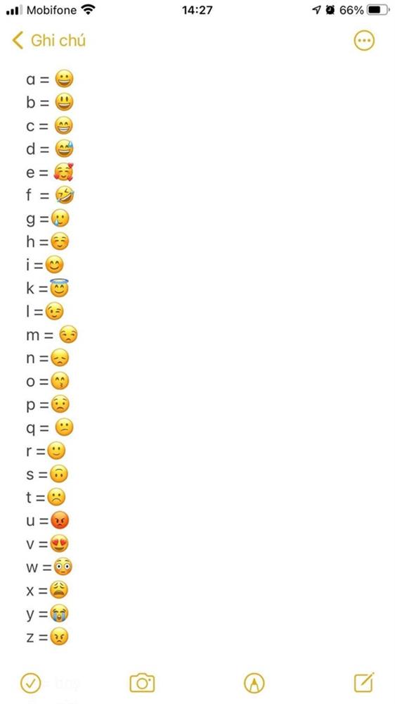 Thế nhưng khi đến phần "Ghi chú" ở điện thoại, cô đã tìm ra bảng quy đổi cho những kí tự mà chồng và bồ nhắn cho nhau. Người chồng và cô bồ đã tạo ra cả một bảng chữ cái "đột biến" từ abc bình thường thành các icon.