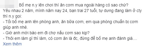 Theo đó, vì người yêu báo quá gấp trong khi công việc lại bận bịu, cô gái đành mua sẵn cơm hàng để chỉ việc bày ra ăn nhưng điều đó không làm bố mẹ chồng tương lai vừa ý. Những dòng tin nhắn của người bạn trai rằng bố mẹ anh ta không hài lòng, hơn nữa còn chê trách đủ điều khiến cô gái vừa buồn vừa tức.