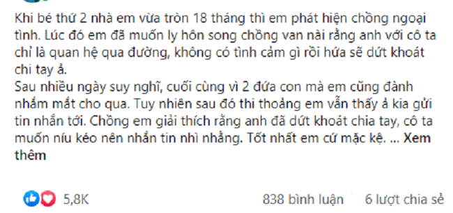 "Khi bé thứ 2 nhà em vừa tròn 18 tháng thì em phát hiện chồng ngoại tình. Lúc đó em đã muốn ly hôn song chồng van nài rằng anh với cô ta chỉ là quan hệ qua đường, không có tình cảm gì rồi hứa sẽ dứt khoát chi tay ả.