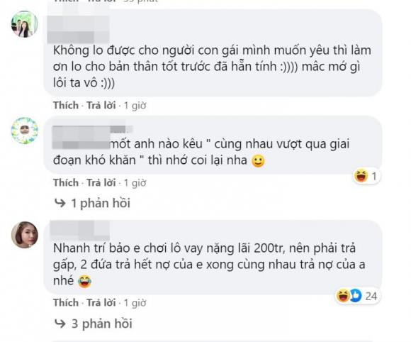 - Con gái bây giờ toàn đứa thực dụng, phải yêu người có tiền, có nhà, có xe cơ, không muốn cùng nhau trải qua khó khăn thì chỉ có ăn... ăn... nhé''.