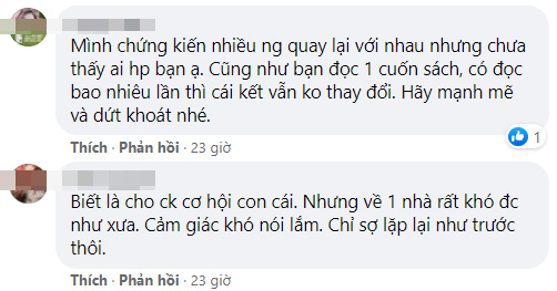 Tâm sự rằng xé của người mẹ 2 con đã nhận được rất nhiều đồng cảm và chia sẻ của cư dân mạng, đặc biệt là chị em phụ nữ. Hầu hết mọi người đều đã khuyên chủ top không nên vội vàng quyết định mà dành thời gian kiểm chứng thêm đối phương cũng như nhận định lại rõ ràng tình cảm của mình kẻo mắc sai lầm lần nữa.