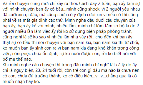 Mình cũng suy nghĩ, có cách nào khác không? Nhưng nếu mình là bạn ấy cũng khó thật. Rồi tự dưng mình nghĩ hay là mình chấp nhận làm bố đứa bé, vì thật ra trong tận đáy lòng mình vẫn có tình cảm với bạn ấy nên hôm nay mình hỏi: